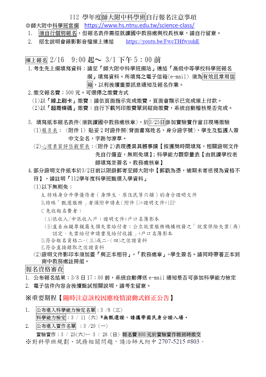 ◎請隨時留意師大附中科學班的公告資訊。