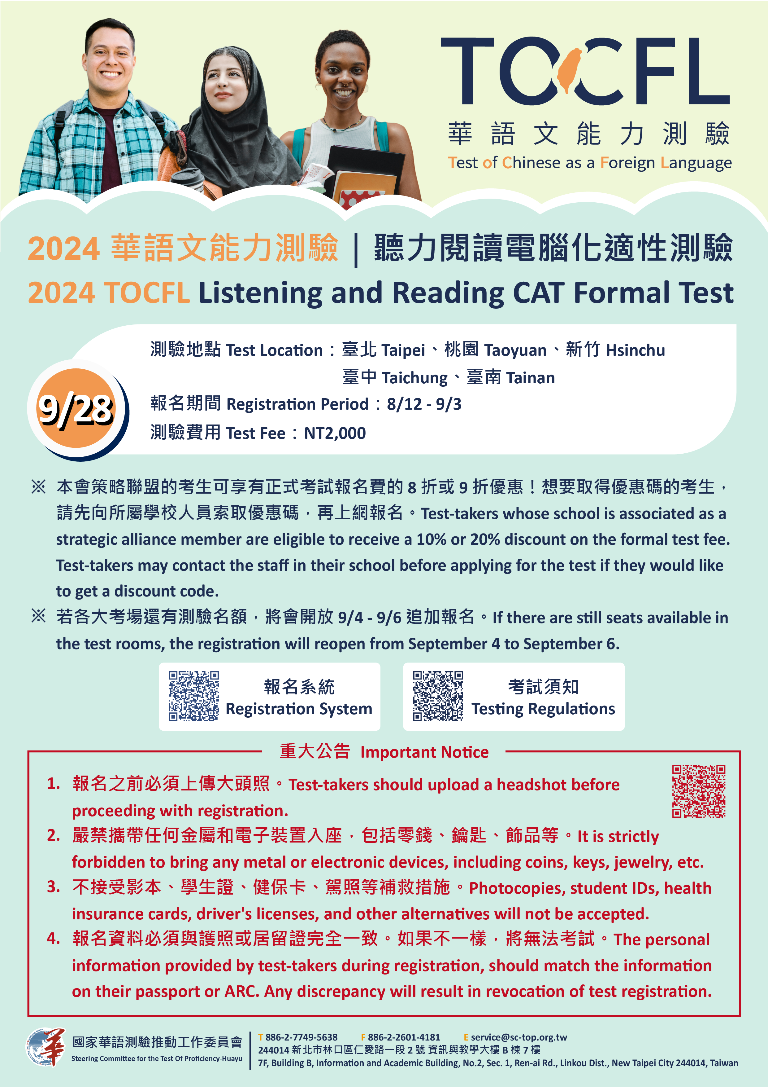 說明: 一、依據國家華語測驗推動工作委員會113年8月8日華測字第 1132000114號函辦理。 二、報名時程:自113年8月12日(星期一)至9月3日(星期 二)止。報名截止日後,若有剩餘名額,將開放追加報名 至9月6日(星期五)。 三、考試項目:聽讀測驗—電腦化適性測驗。 四、考試地點:國立臺灣師範大學、國立臺北教育大學、中國 文化大學推廣教育部、中國科技大學、中原大學、國立清 華大學、國立臺中教育大學、東海大學、崑山科技大學及 長榮大學,共10所考試中心。 五、考試費用:新臺幣2,000元。 六、該會自此場考試開始實施新版報名與考試規則,相關說明如附件。重大變革包含: (一)報名之前須上傳大頭照。 (二)僅接受憑護照或居留證入場,不接受影本或翻拍照、雙 證件如學生證、健保卡等補救措施。 (三)嚴禁攜帶任何金屬和電子裝置入座,包括零錢、鑰匙、 飾品等。 (四)報名資料如果與護照或居留證上的不一樣,將無法參加 考試。 七、優惠訊息:為該會策略聯盟單位,所屬外籍人士可享九折 優惠。 八、報名網址:https://reg.sc-top.org.tw/。 九、線上模擬測驗:https://tocfl.edu.tw/index.php/exam /test/page/19。 十、檢附旨案新版報名與考試規則說明及宣傳海報各1份。