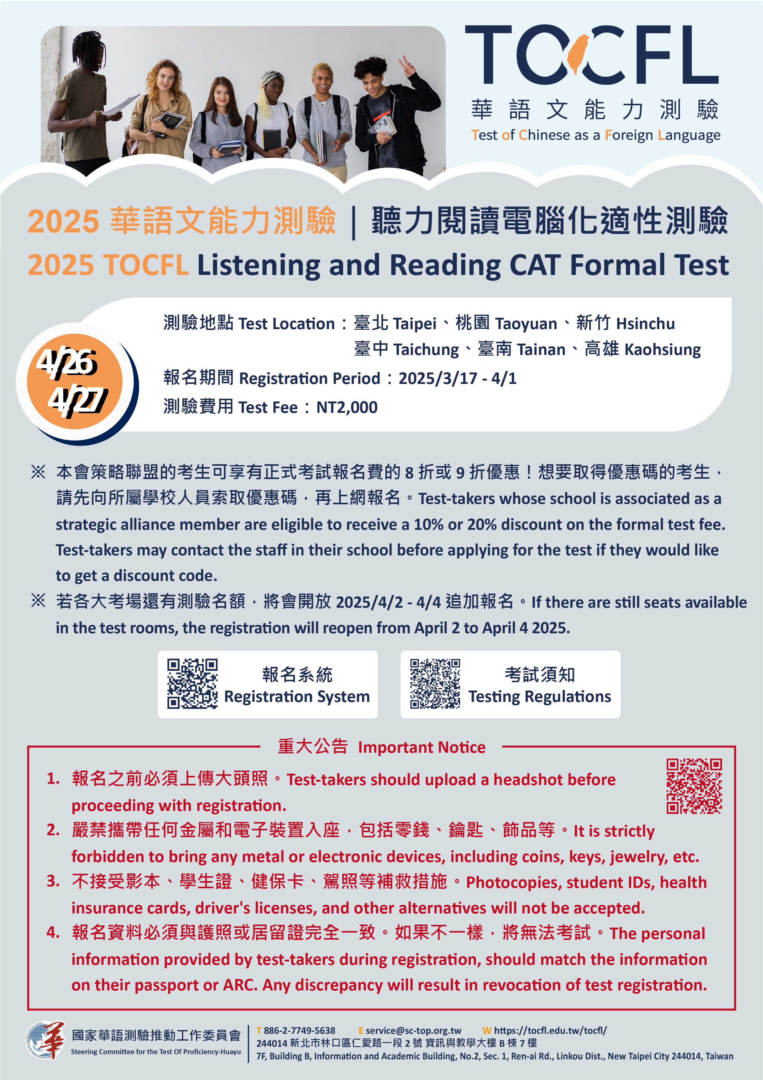 三、測驗日期:4月26至4月27日(星期六、星期日)聽讀測