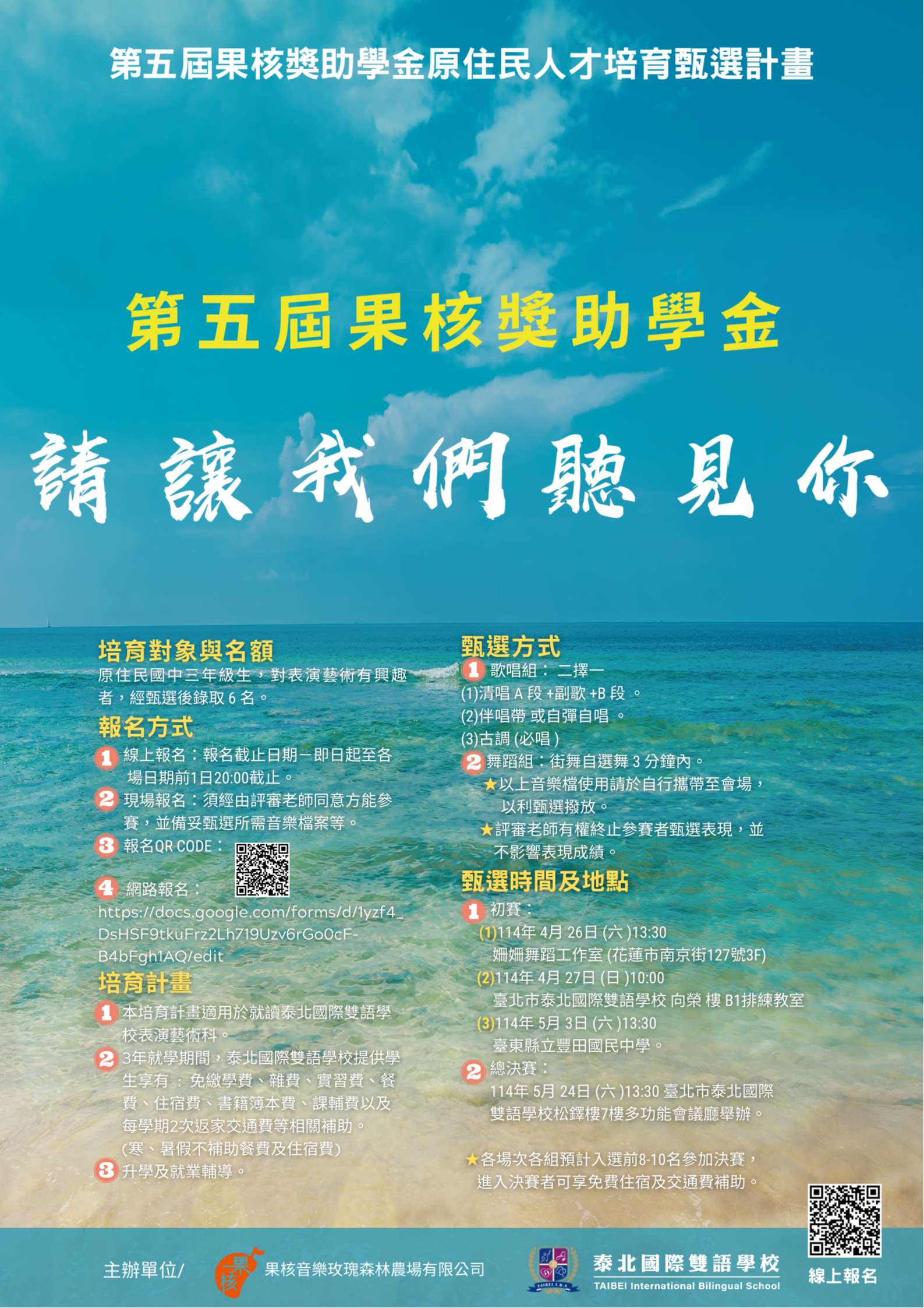 2、 114 年 4 月 27 日(星期日)10:00於泰北國際雙語 學校 向榮樓 B1 排練教室辦理。(臺北市)