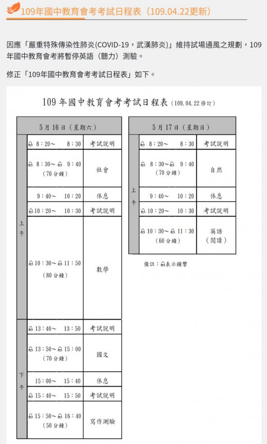 109年國中教育會考英語聽力測驗因應疫情停考說明