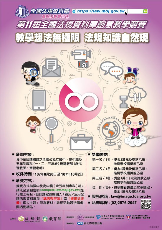 檢送「第11屆全國法規資料庫法規知識王網路闖關競賽要點」及「第11屆全國法規資料庫創意教學競賽要點」各1份,