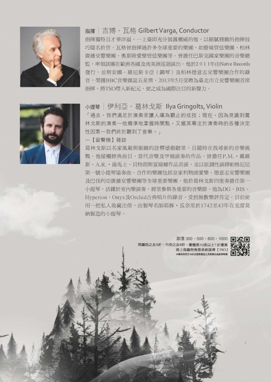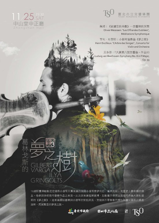 一、臺北市立交響樂團(以下簡稱本團)將於11月25日假中山堂中正廳演出音樂會《葛林戈斯的夢之樹》,本場音樂會請本團首席指揮吉博‧瓦格(Gilbert Varga)與當代小提琴協奏曲演奏權威伊利亞‧葛林戈斯(Ilya Gringolts)擔任獨奏,演出法國作曲大師杜替耶的作品《夢之樹》作為本曲的臺灣首演。獻上一場別具風味的交響盛宴,音樂會宣傳單如附件1、2。