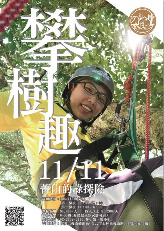 一、菁山遊憩區位於陽明山國家公園內,此次以攀樹為主打活動,搭配園區導覽解說以及葉片拓染 DIY,打造陽明山親近植物與自然的半日遊活動,有登高膽識與體能的挑戰,及構圖設計與手部纖細的動作,體驗最具深度的綠探索之旅。