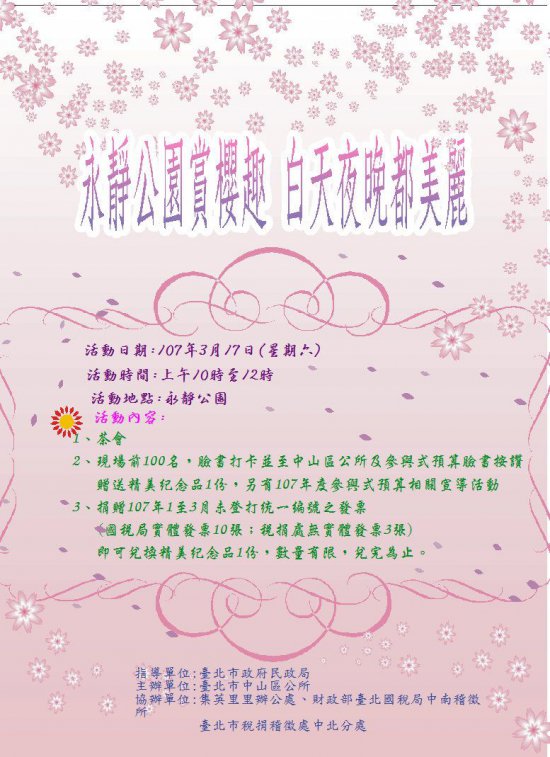 2018中山區基層藝文民俗表演活動系列之一「永靜公園賞櫻趣 白天夜晚都美麗」於3月17(星期六)上午10時至12時假永靜公園舉辦,現場除了有茶會點心,音樂演奏、參與式預算活動及稅務宣導外、另前100名臉書打卡拍照上傳至本所臉書,贈送櫻花紀念品1份;另「古蹟巡禮 遺址再發現」於3月18日(星期日)上午9時至12時辦理走讀導覽,邀請大家一同探索中山區的特色景點、古蹟及人文風情,走讀活動需事先報名,即日起請至公民會館走讀趣網站報名