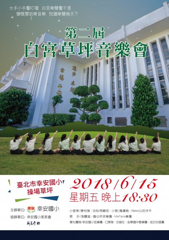 說明:幸安國小謹訂於107年6月15日(星期五)晚上18時30分假幸安國小操場(臺北市大安區仁愛路三段22號)舉辦「白宮草坪音樂會」,除了本校音樂團體,也邀請到音樂領域的專業人士一起共襄盛舉,節目精彩可期,敬邀大家一同來欣賞。