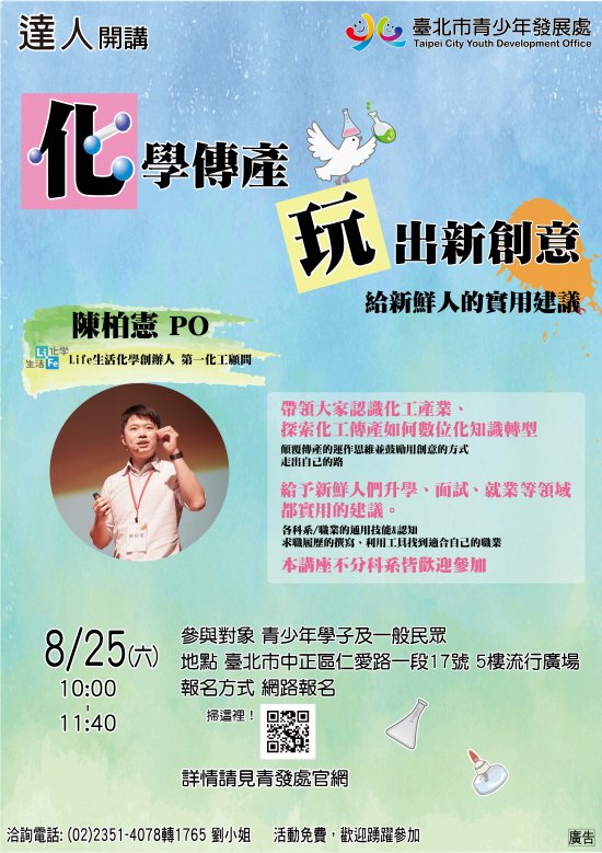 (二)60字:臺北市青少年發展處107年8月25日(六)10:00舉 辦達人開講「化學傳產玩出新創意」,邀請Life生活化 學創辦人陳柏憲。詳情請見青發處官網。