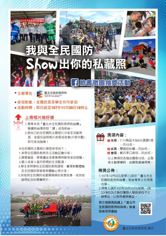 本活動期間自即日起至107年11月30日18時止,活動辦法詳如計畫書,將全民國防主題相片分享至「臺北市全民國防教育粉絲團」臉書粉絲專頁 即可參加抽獎。