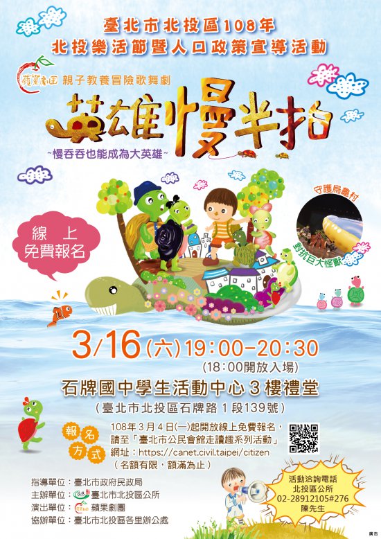 二、請協助刊登相關宣導訊息如下:「臺北市北投區公所訂於 108年3月16日(星期六)下午7時假石牌國中學生活動中心3 樓禮堂(臺北市北投區石牌路1段139號)辦理108年度北投 樂活節暨人口政策宣導活動『英雄慢半拍』兒童劇演出,3 月4日(星期一)起開放線上免費報名,請至『臺北市公民 會館走讀趣系列活動』報名網址:https://canet.civil.taipei/citizen,歡迎有興趣的民眾報名參加(名額有 限,額滿為止),活動洽詢電話28912105轉276北投區公所 人文課陳先生。」。