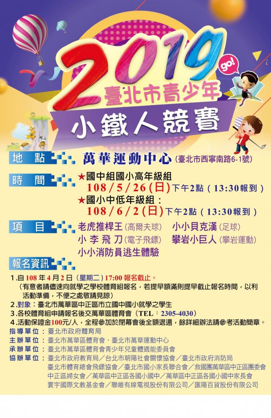 賽事資訊如下 (一)108年5月26日為國中組、國小高年級組競賽。 (二)108年6月2日為國小中低年組競賽。 (三)競賽項目有足球、攀岩、高爾夫球、飛鏢、消防體驗等5項。