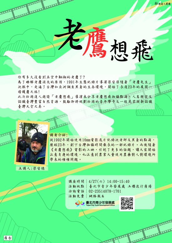 轉知-臺北市青少年發展處108年4月27日(六)下午2時舉辦達人開講「老鷹想 飛」之壯遊講座
