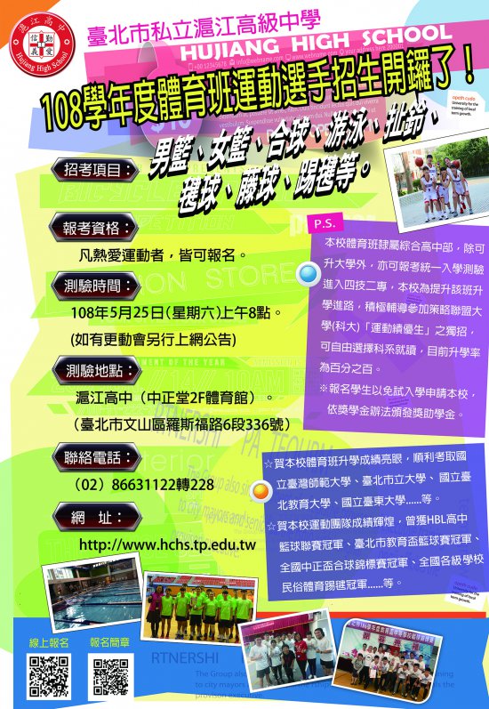 轉知-臺北市私立滬江高級中學108學年度體育班運動選手招生