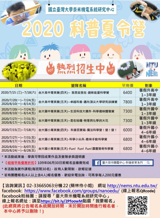 一、為有效推廣科學科技回應社會議題,並厚植我國科學文化 向下紮根,本校「2020年科普夏令營」將推出「高中」、 「國中」及「國小」之菁英課程。