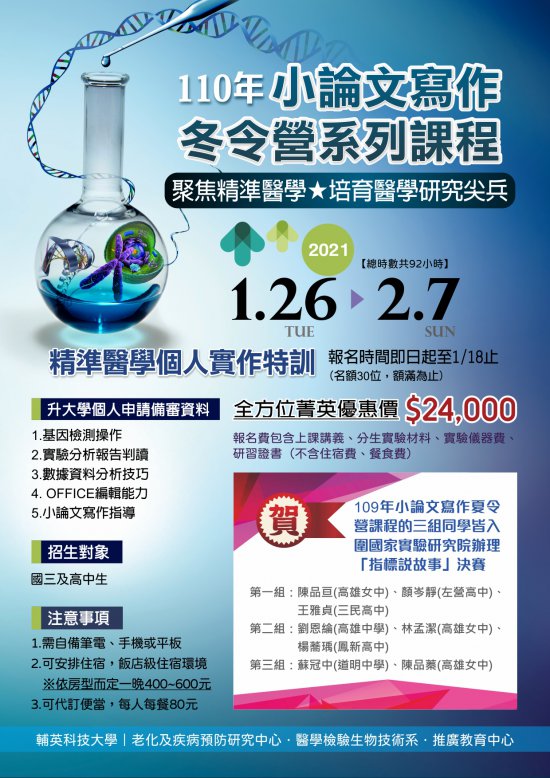 一、本校訂於110年1月26日至110年2月7日辦理「小論文寫作寒 令營系列課程」,開課資訊詳如簡章說明,即日起開始報 名。
