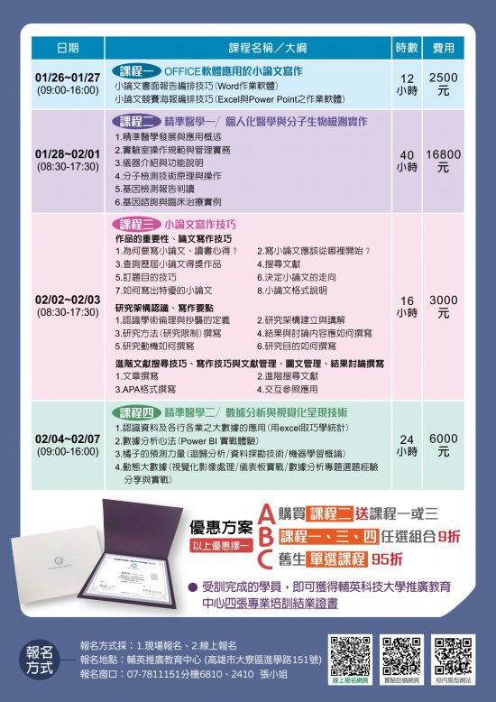 三、報名及繳費方式: (一)現場報名-至本校推廣教育中心繳交報名表、2吋大頭照4 張、身分證正反面影本及課程費用。 (二)線上報名-至Google表單(請參閱課程DM,掃描線上報名 網頁QR CODE)填寫報名資料暨繳交課程費用(報名完成 後將以電子郵件通知匯款帳號)即完成報名,並於課程 當日繳交2吋照片4張、身份證正反面影本。
