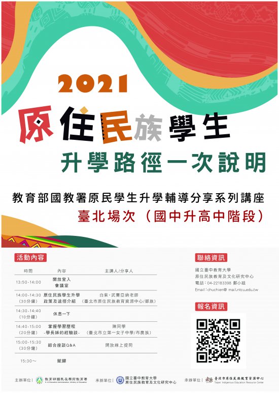 二、旨揭講座係由教育部國民及學前教育署委託國立臺中教育 大學與本市原住民族教育資源中心共同辦理。本次講座以 線上方式辦理,邀請本市原住民族教育資源中心白紫•亞 賽武納老師針對原住民族學生國中階段,提供原住民族學 生及家長了解相關政策及升學訊息。