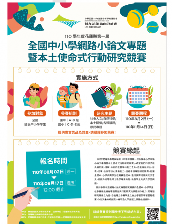 (五)研究主題:以下5個研究主題(擇一擬定專題研究名稱, 並至學生社群專題網站申請社群空間,每校至少提報1件 參賽): 1、社會人文(哲學、文學、藝術、歷史、語言等)。 2、自然科學(物理、化學、數學、生物、地球科學等)。 3、本土關懷(人文關懷、風土環境、民俗、古蹟、族群語 言等)。 4、各類議題(健康促進、環境教育、性別教育、海洋教育 等)。 5、原民專題(原民文化、原民環境、原民議題、原民教育 等)。