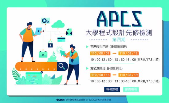 一、APCS「大學程式設計先修檢測」(Advanced Placement Computer Science,APCS)主要為檢測考生程式設計的能力,讓具備程式設計能力之高中職學生,有個具公信力的檢測學習成果,並提供做為大學優秀選才的參考依據。