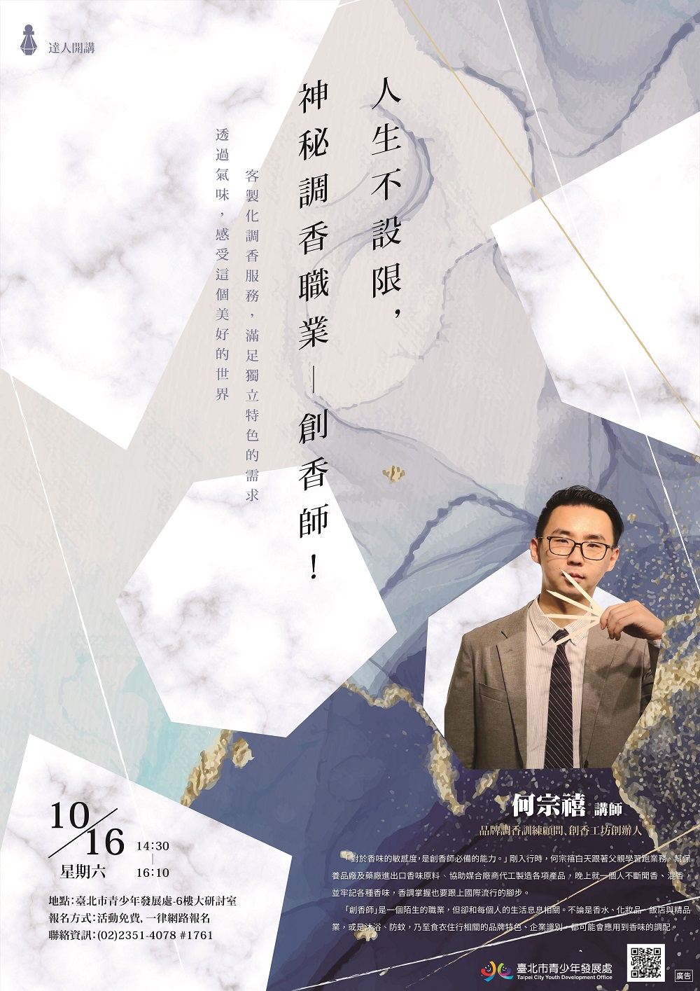 (三)30字:青發處10/16何宗禧達人開講:人生不設限,神秘 調香職業-創香師!活動詳官網。