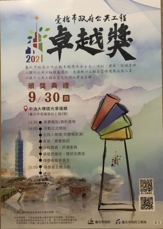 臺北市政府為「110年度臺北市政府公共工程卓越 獎」頒獎活動,訂於於110年9月30日假台灣中油股份有限公司-國光 會議廳(臺北市信義區松仁路3號)舉行,可詳參網址:https://gpis.taipei/award/index.html