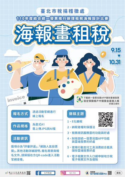二、市府稅捐處為加強推廣統一發票兌獎APP的功能及雲端發票 的好處等,舉辦「海報畫租稅」租稅海報設計比賽,請轉 知貴校師生參與。