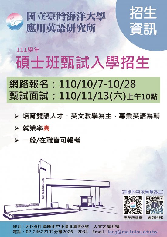 一、因應2030雙語國家政策,英語能力將成為就業必備條件之 一。海大應用英語研究所以英語教學訓練爲主,專業英語 為輔,適合對英語教學有興趣或未來職業欲使用英語者就 讀。