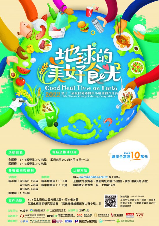 一、由教育部、行政院環境保護署、行政院農業委員會指導, 本會主辦之「氣候變遷國中小繪畫創作比賽」迄今已舉辦 11屆,一共累計37國、52,666名學子參與。本屆為第12 屆,為呼應聯合國永續發展目標(SDGs)的第2、12項,以 「地球的美好『食』光」為主題,強化國中小學生、教師 對糧食安全、永續農業、營養均衡與永續消費與生產等相 關議題的認知,以及拓展國際觀並付諸實際的氣候行動。 比賽也呼應聯合國永續發展目標第13項,鼓勵積極採取氣 候行動,並提升大眾相關意識。