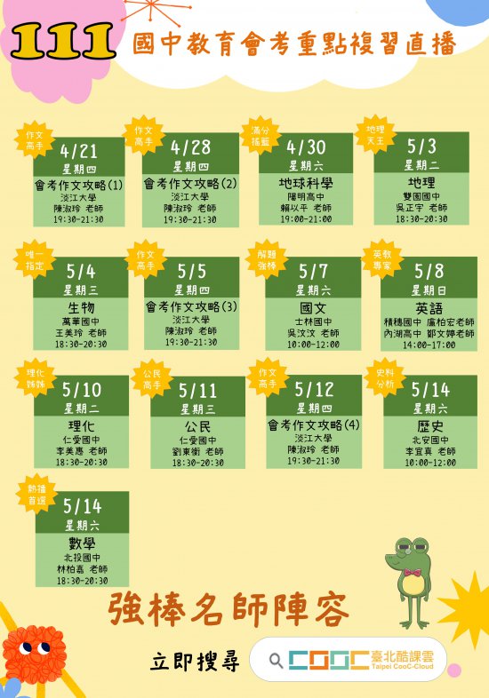 二、為推廣臺北酷課雲及酷課雲網路課程相關資源與服務,針對全國國中教育會考(以下簡稱會考)考生以線上直播方式進行考前重點複習課程,以協助考生統整及掌握解題關鍵。