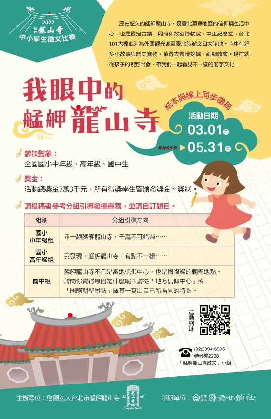 四、「2022艋舺龍山寺中小學生徵文比賽 我眼中的艋舺龍山寺」活動網址https://bit.ly/320t70i 或洽活動專線 (02)2394-5995分機2208。