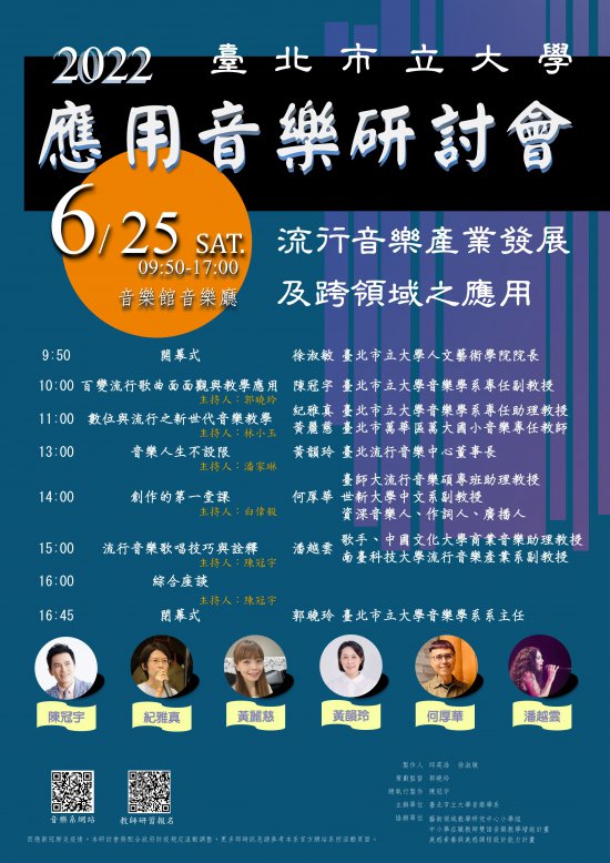 一、本校音樂學系謹訂於111年6月25日(星期六)9時50分至17 時,於本校博愛校區音樂館音樂廳舉辦「2022應用音樂研 討會-流行音樂產業發展及跨領域之應用」,本次研討會 除本校師長擔任主講人外,特邀流行音樂產業師長(黃韻 玲、何厚華、 潘越雲)擔任主講人,敬邀各界師長踴躍參 與,敬請轉發周知。