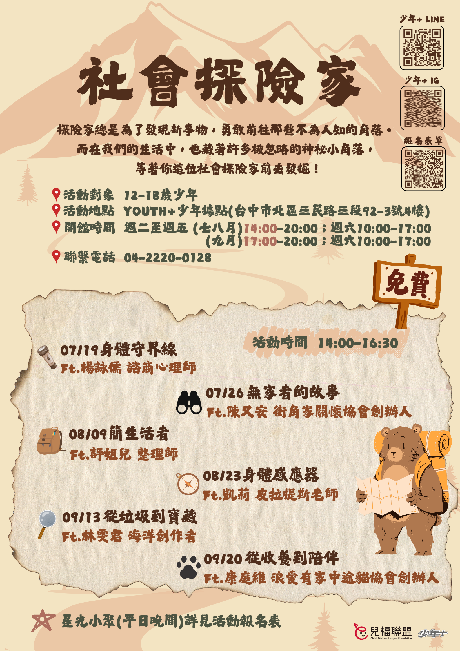 兒童福利聯盟基金會「少年+」據點辦理2025年「社會探險家」社會共好主題活動及星光小聚,鼓勵同學報名參與。
