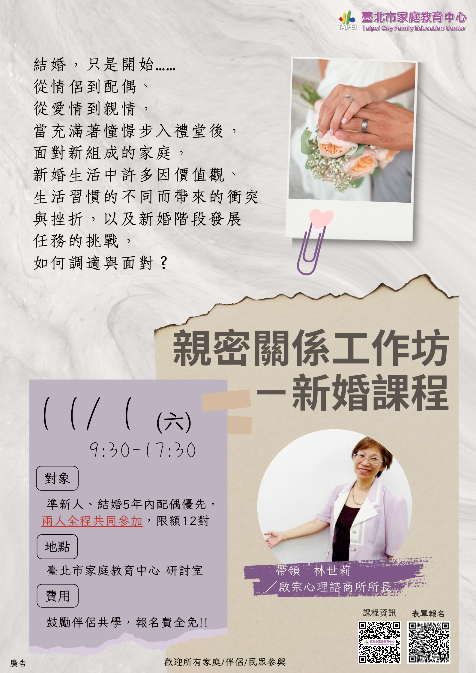 歡迎參加臺北市家庭教育中心11月1日舉辦之「親 密關係工作坊-新婚課程」,幫助家庭新鮮人迎接婚姻生活挑戰,學習欣賞包容,順利並持續經營關係!