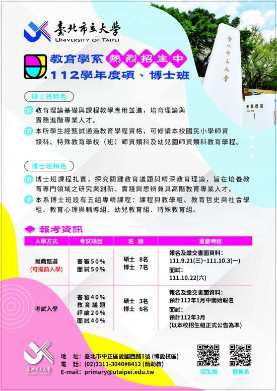 一、本校為全臺第一所高等教育學府,教育學系承接師資培育 與學術研究百年基業。碩士班招生8名;博士班設有五組專 精課程:課程與教學組、教育哲史與社會學組、教育心理 與輔導組、幼兒教育組與特殊教育組,合計招生7名。