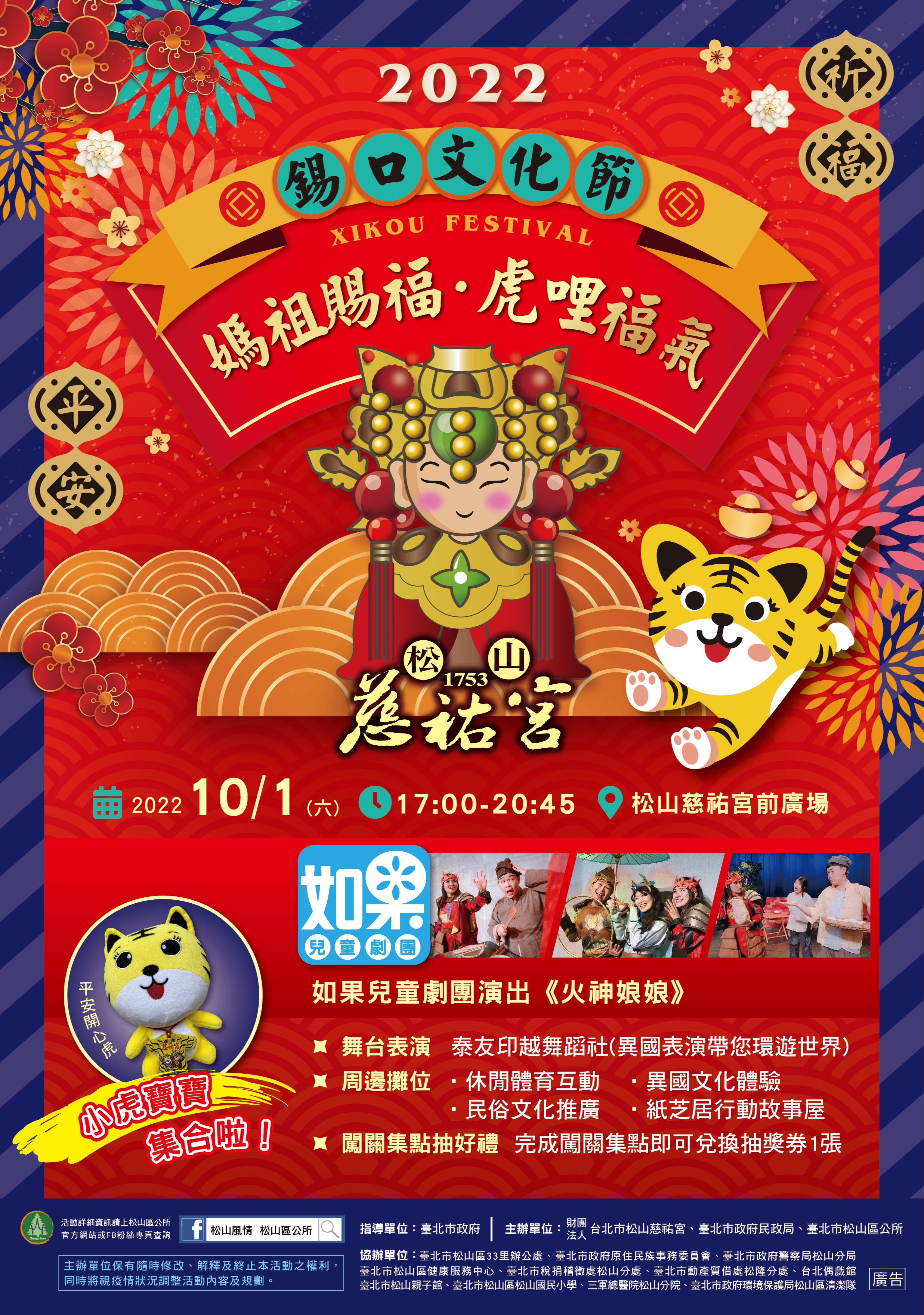 四、網站及粉絲團宣傳文稿如下: (一)標題:松山區公所10月1日(六)邀請您一同參與「2022 錫口文化節 媽祖賜福.虎哩福氣」活動。 (二)內容:臺北市松山區「2022錫口文化節 媽祖賜福.虎哩 福氣」即將登場!活動將於10月1日(六)下午5時至8 時45分於松山慈祐宮前廣場舉辦。今年活動特別以「虎 年福氣」為規劃主軸,活動當日再次邀請廣受好評的 「如果兒童劇團」帶來《火神娘娘》表演,舞台區也有 新二代演唱表演、異國風情表演及抽獎活動等;現場周 邊攤位將有民俗文物推廣、親子手作DIY、原住民族語教 學、紙芝居行動故事屋、復古童玩遊戲及闖關抽獎換好 禮等,如此精彩的廟埕活動,誠摯邀請市民朋友同來抓 住虎年尾巴得到好福氣。活動詳情請至臺北市松山區公 所網站、松山風情臉書粉絲專頁查詢或電洽(02) 87878787分機733林小姐。