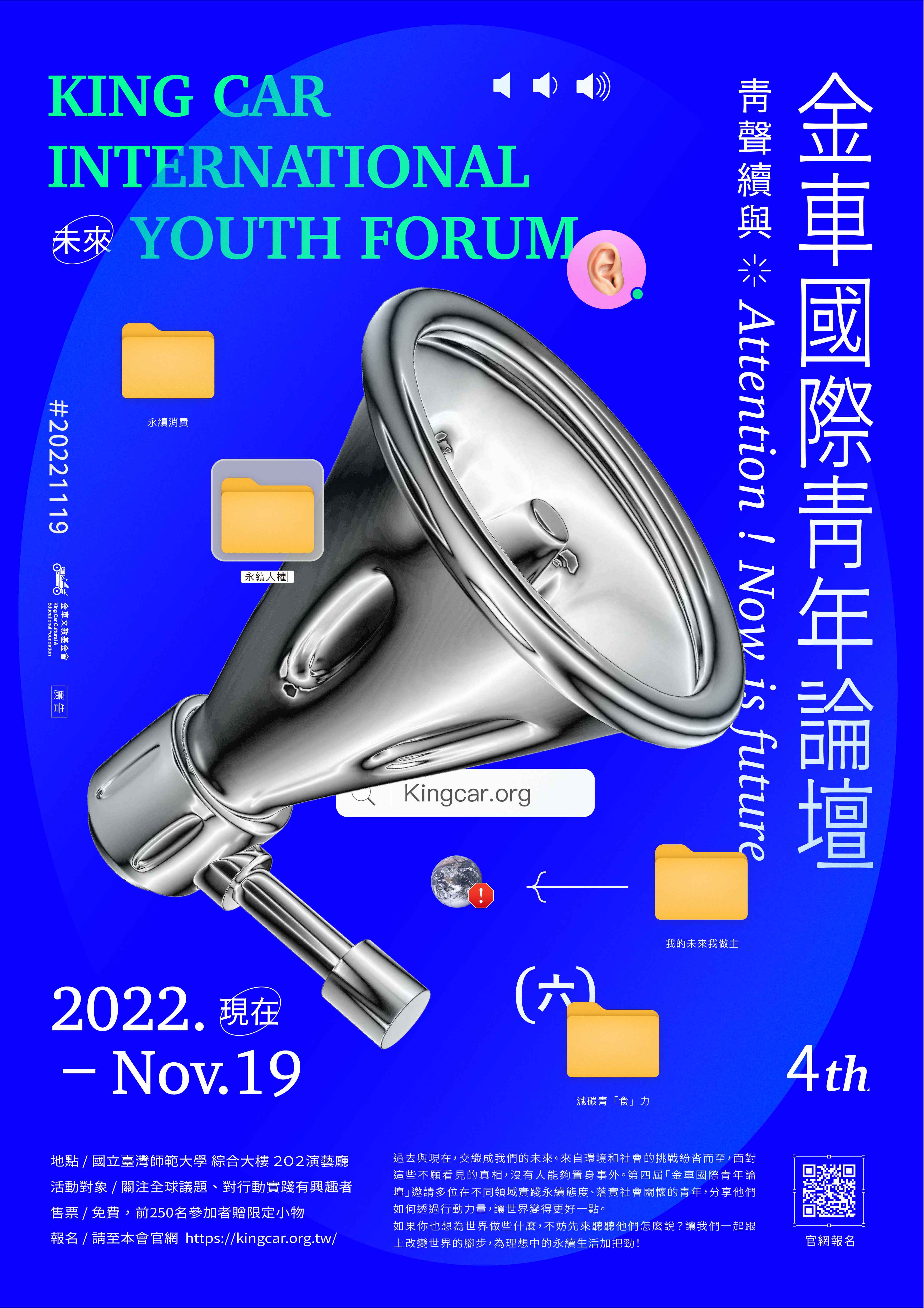 二、活動辦法與報名資格 (一)活動日期:2022年11月19日 (六) (二)活動時間:上午09:00-12:30/下午13:20-17:00 (三)活動地點:國立臺灣師範大學 綜合大樓202演藝廳 (四)活動對象:高中、大專院校學生及各級學校教師;對國 際議題、社會創新、社會參與、公益行動有興趣者 (五)活動費用:免費,需事先報名;提供學生參加證明/教師 研習時數(六)報名日期:即日起至活動額滿為止 (七)活動詳情:請上本會官網 kingcar.org.tw 》我要報 名》金車國際青年論壇