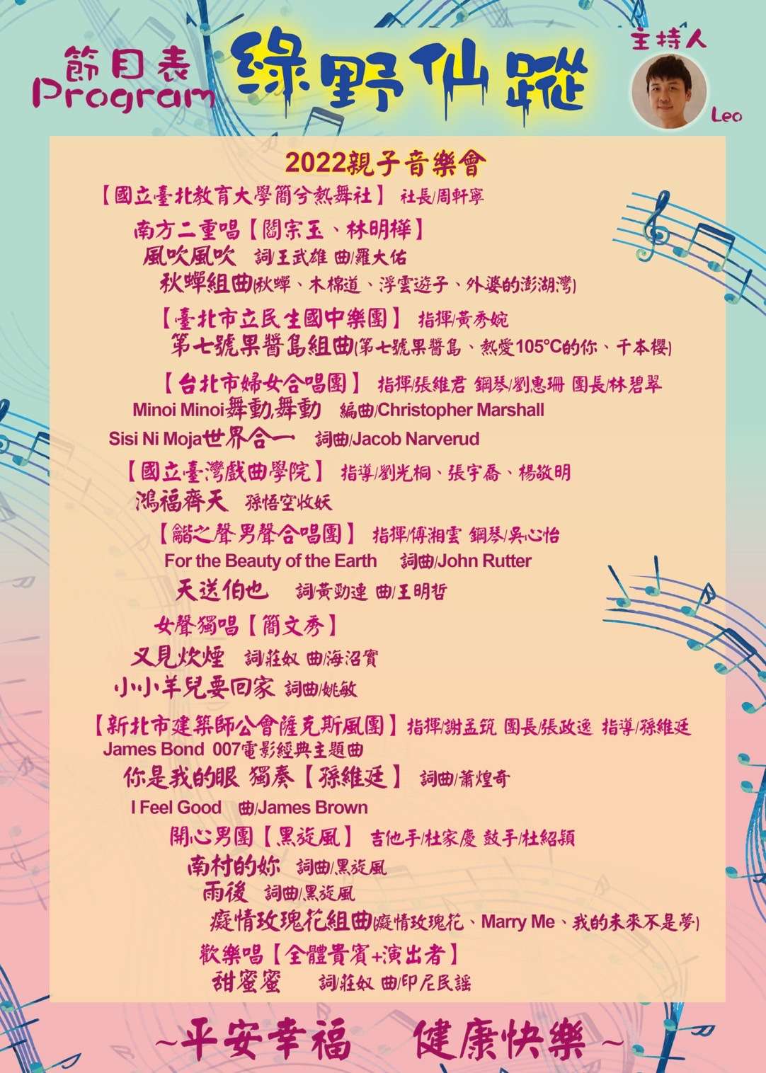 二、本次音樂會將邀請聲樂家簡文秀教授、 南方二重唱、孫維 廷、開心男團黑旋風、台北市婦女合唱團、國立臺北教育 大學簡兮熱舞社、國立臺灣戲曲學院、新北市建築師公會 薩克斯風團、臺北市立民生國中樂團及龤之聲男聲合唱團 等團體一同演出,是為一場親子同歡的音樂會。(詳附件)