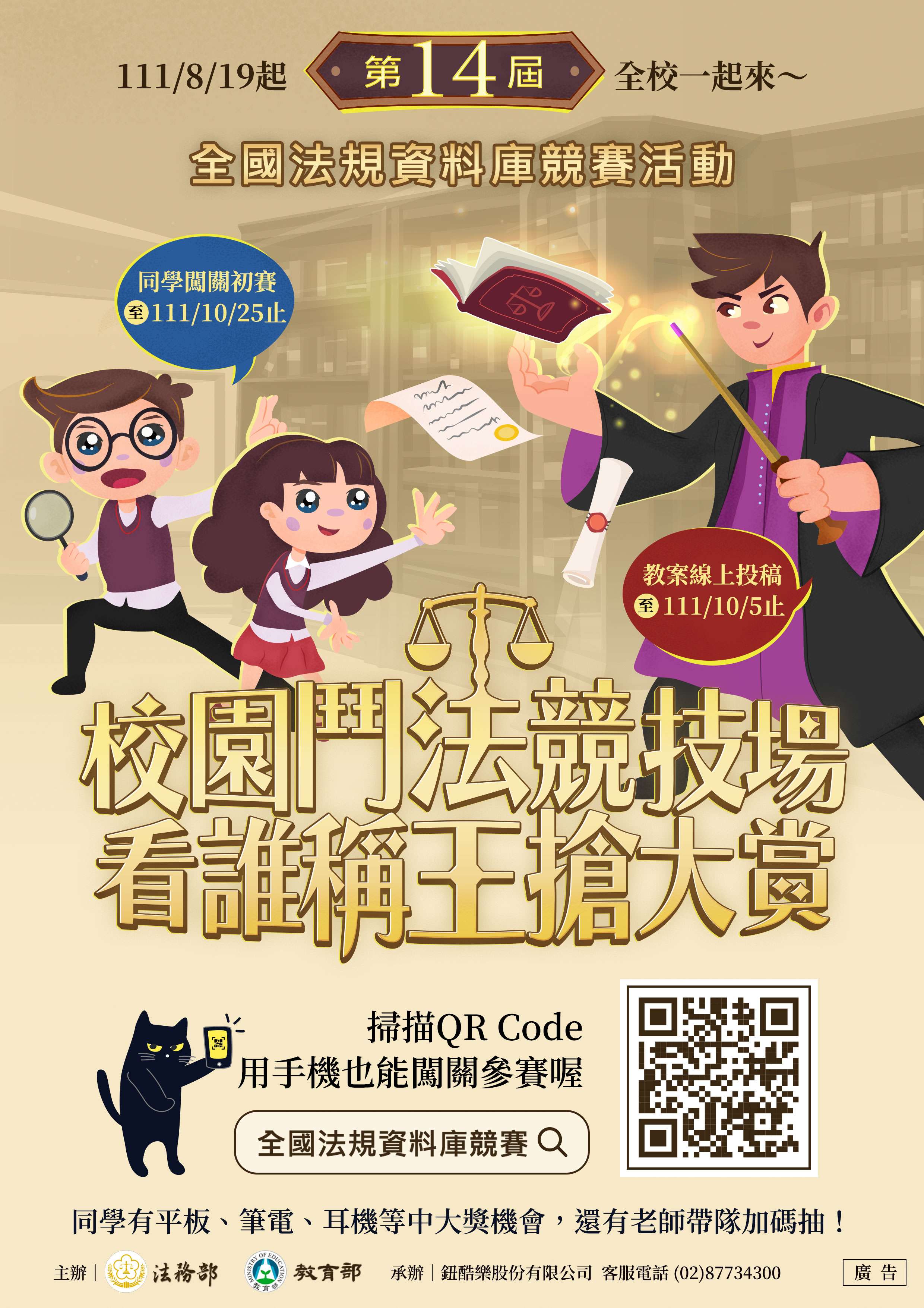 5、活動獎項:各組取現場決賽前5名學生為法規知識王得獎者,並設「學校推動成效獎」及「縣市政府教育局(處)推動成效獎」,鼓勵推動具成效之學校及教育局(處)。