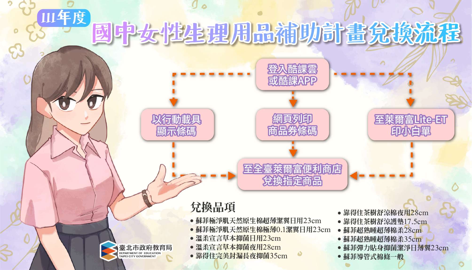 二、本局自111年3月7日起,每月派送本市國中女學生生理用品 兌換券2張,提供學生自行至全臺萊爾富兌換生理用品。本案融合性平教育精神,期使學生正向看待月經議題。