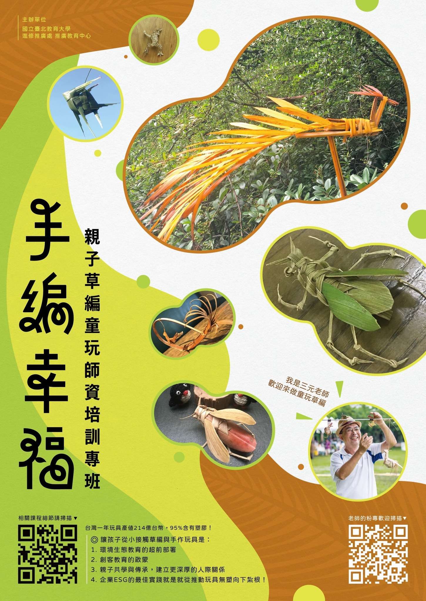 二、草編幸福-童玩技藝師資培訓(入門班):特聘專業草編達人 「草編CEO林三元老師」親授,課程包含戶外採集、戶外與 教室型態的教學示範、草編文化歷史理論介紹,豐富多樣 的內容不藏私分享。課程時間為週六9:00-16:00(日期111 /11/12),共6小時。