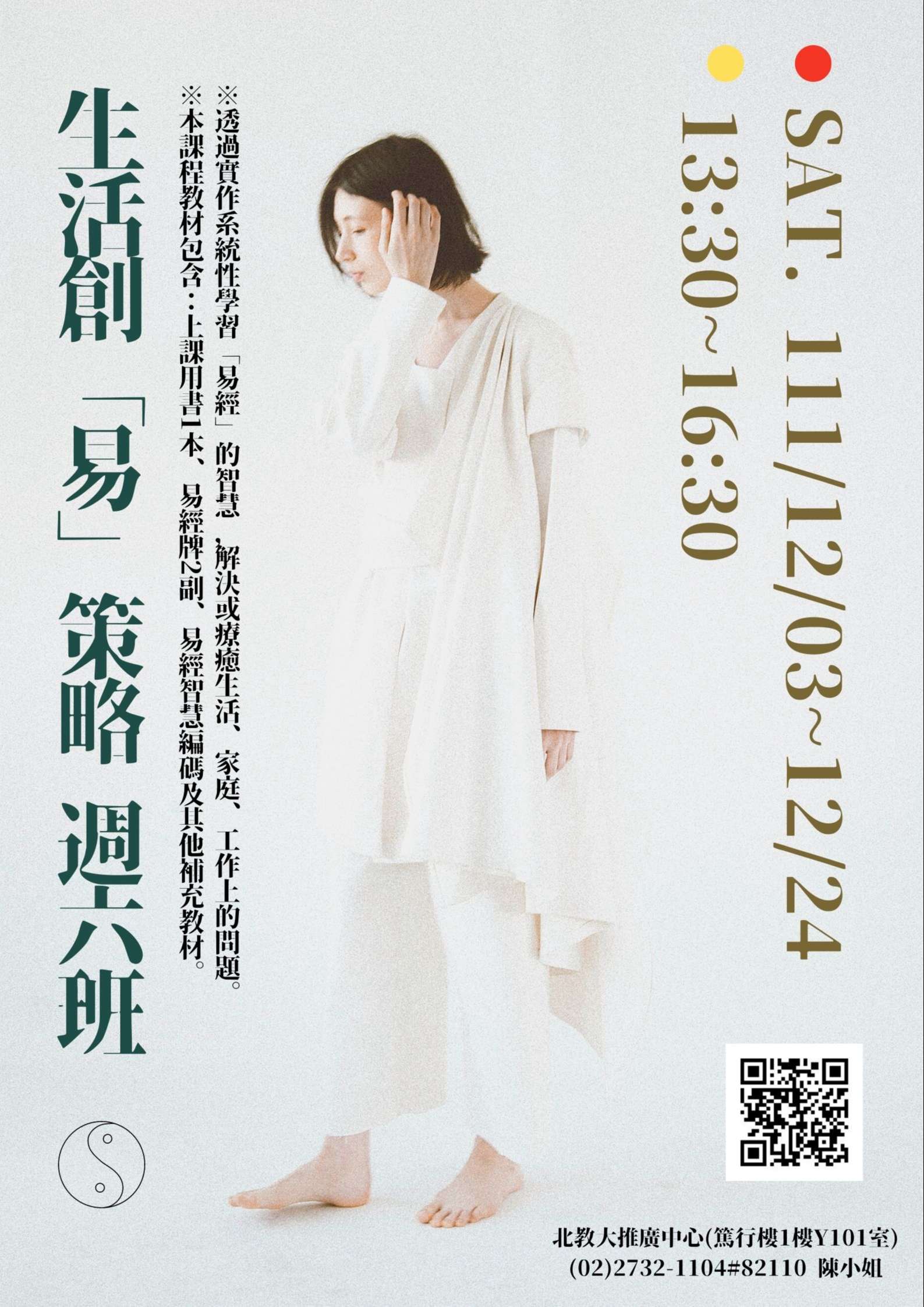 五、易起來-生活創<易>策略:《易經》是一本智慧典籍,本 課程將透過「預測、提點、查閱、驗證」的方式,在實做 中學系統的思考方法,逐步了解如何「應用」《易經》的 智慧解決或療癒生活、家庭、工作上的問題。課程時間為 每週六13:30-16:30(日期111/12/3-111/12/24),共12小 時。