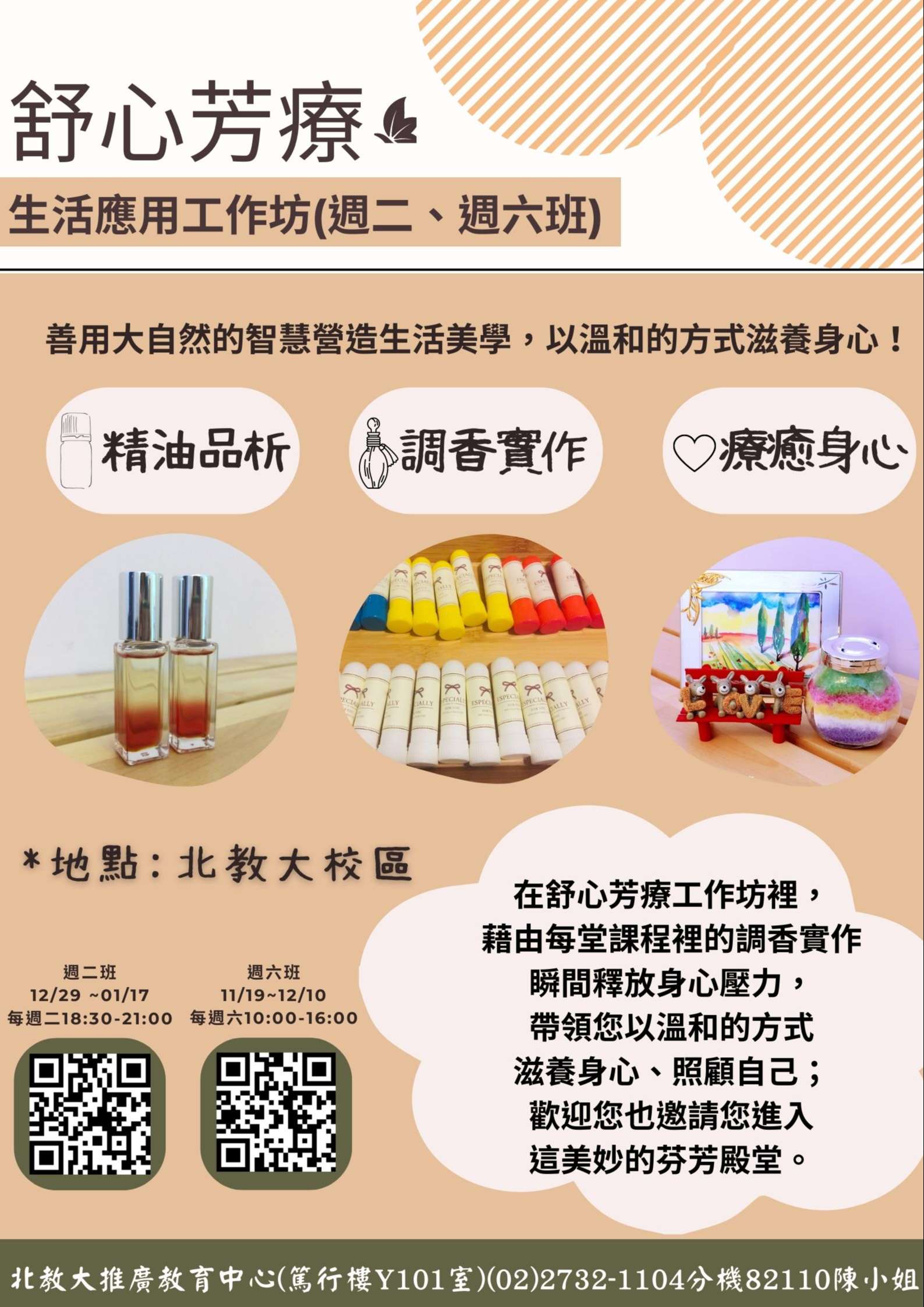 三、舒心芳療-生活應用工作坊:課程內容包含居家美學、肌膚保養、痠痛呵護、情緒照護以及疲勞應用等,藉由每堂課 程裡的調香實作瞬間釋放身心壓力。課程時間可選擇週二 晚間18:30-21:00 (日期111/11/29 112/1/17),或週六10: 00-16:00(日期111/11/19-111/12/10),每梯次共20小 時。