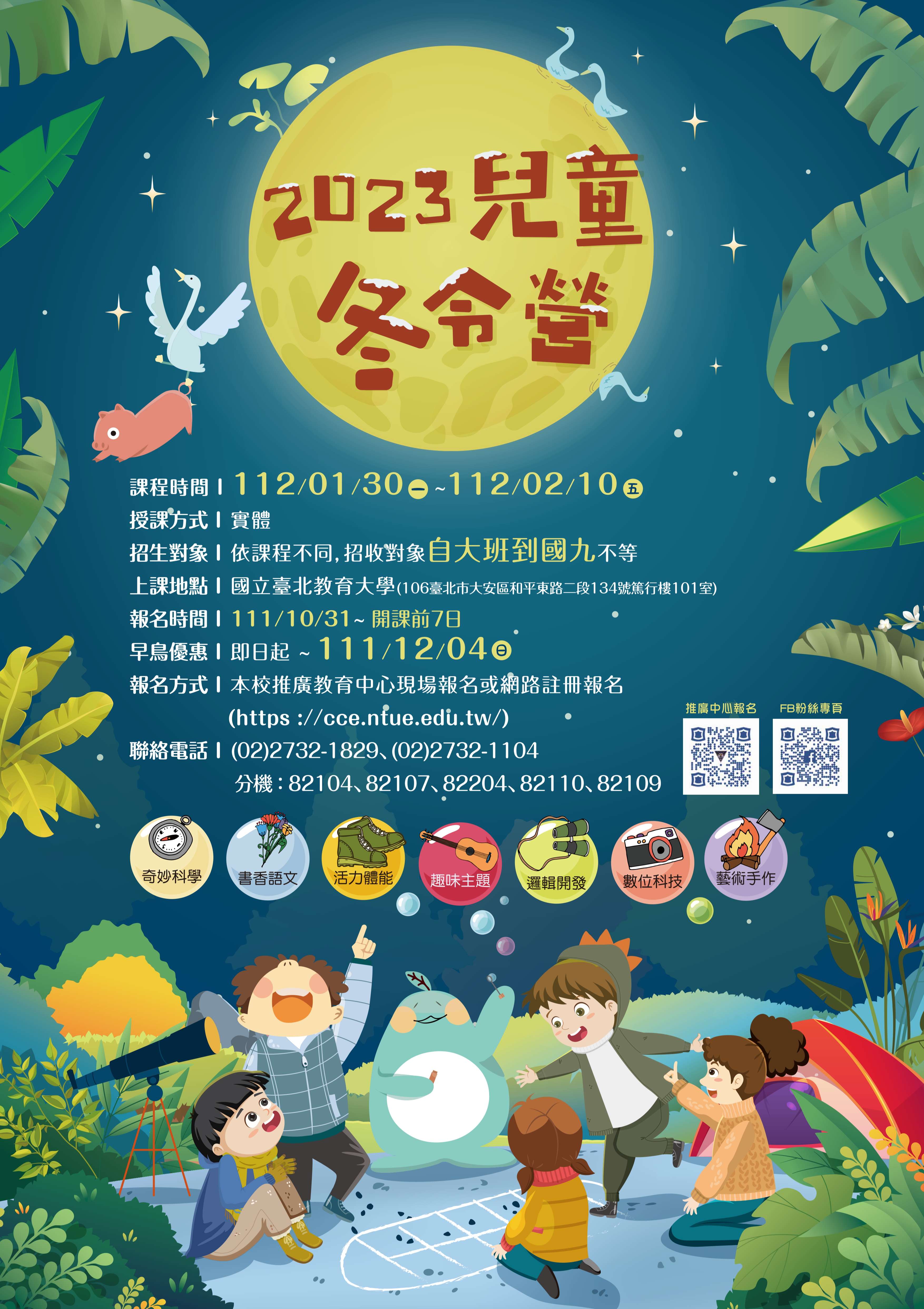 一、旨揭「2023兒童冬令營」謹訂於112年1月30日至2月10日, 課程詳細資訊請至本校進修推廣處推廣教育中心網站 (https://cce.ntue.edu.tw/)查詢。