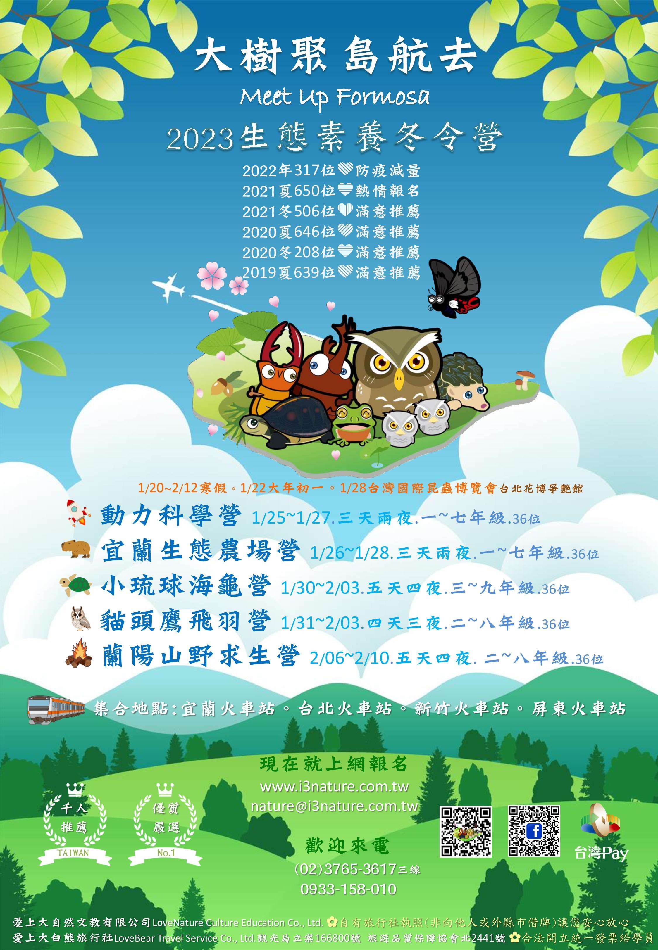 一、2023生態素養冬令營五種課程日期1/25~2/10,招生涵蓋 1~9年級學生,詳請見網站www.i3nature.com.tw。
