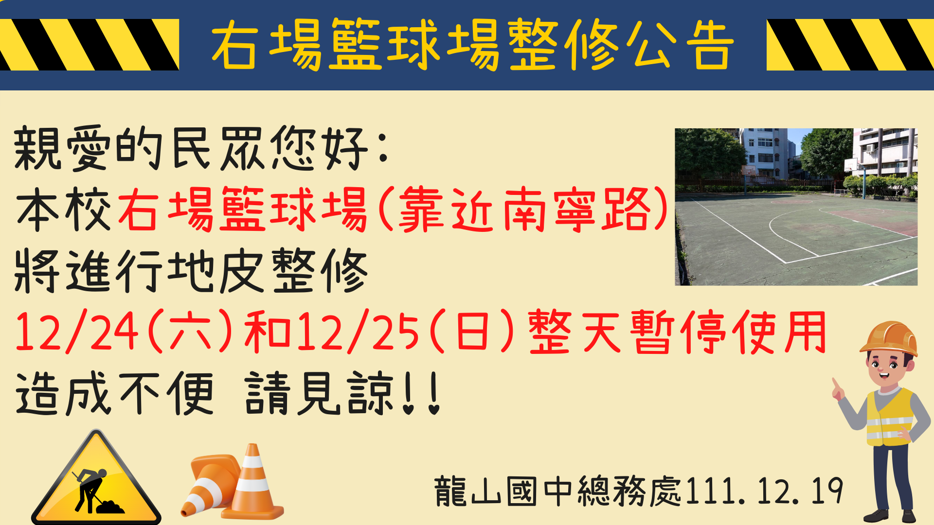 本校右場籃球場(靠近南寧路)將進行地皮整修
