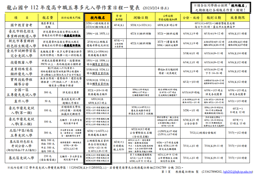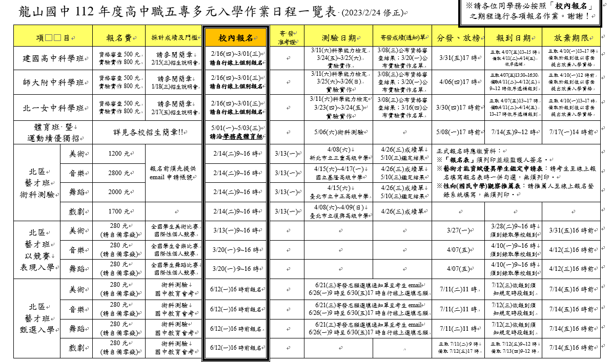 5.九下會不定期在各管道報名前於校網公告相關報名注意事項,請詳閱不定期發放的紙本升學資訊、班級家長群組轉傳的升學資料,以免損及自己升學權益。