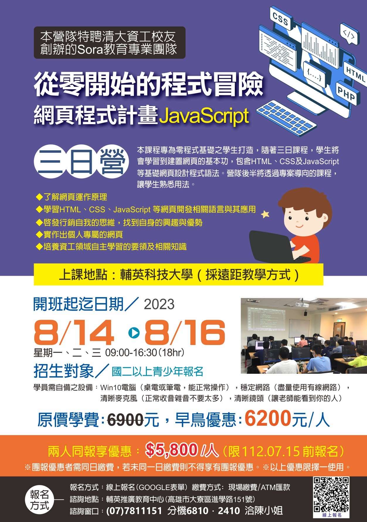 一、課程特色:本課程專為零程式基礎之學生打造,隨著三日課程,學生將會學習到建置網頁的基本功,包含 HTML、CSS及JavaScript等基礎網頁設計程式語法。營隊後半將透過專案導向的課程,讓學生熟悉用法。