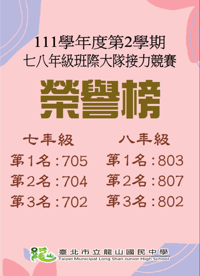 111學年度七八年級校慶班際大隊接力競賽獲獎班級
