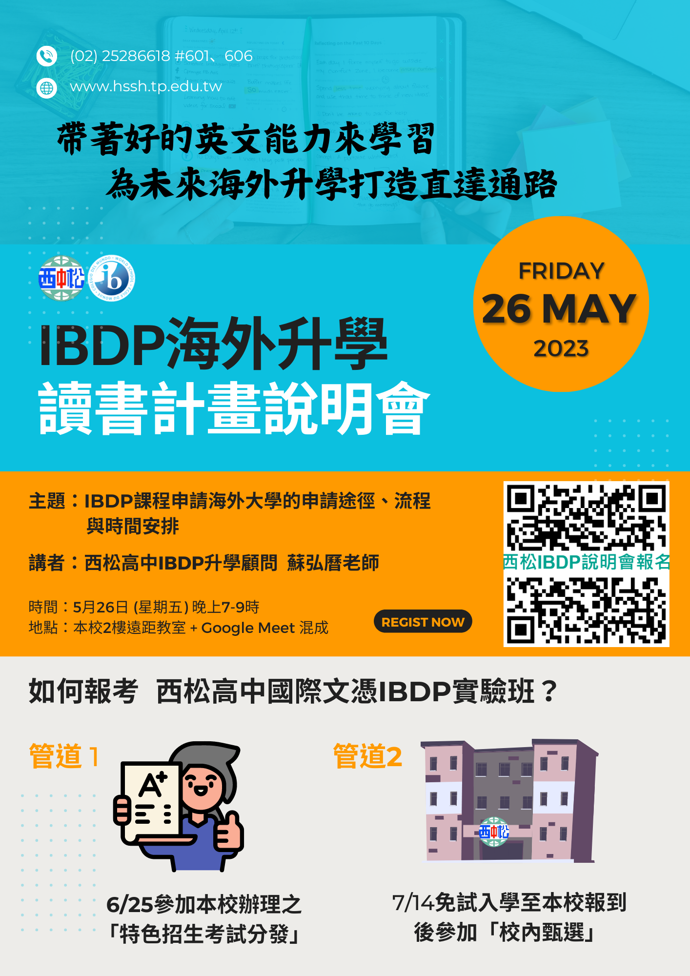 也歡迎多加利用西松高中IBDP國際文憑課程之說明網站,以了解更多關於課程與入學招生管道資訊。網址為:https://sites.google.com/ms2.hssh.tp.edu.tw/xisongibdp/