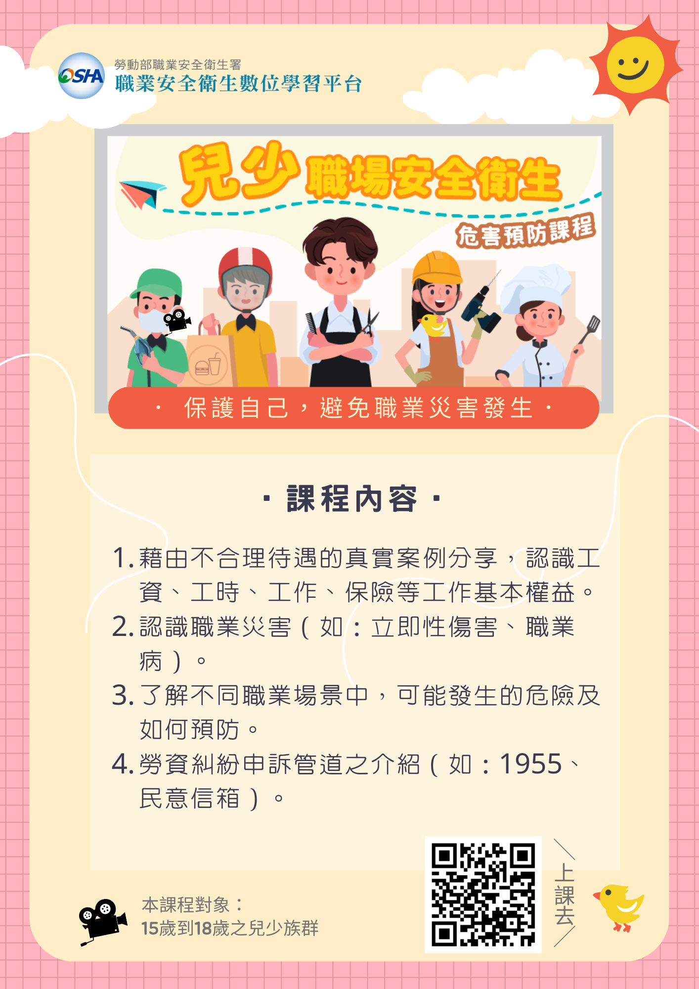 二、為使兒少瞭解職場之安全衛生注意事項、雇主責任、危害預防及相關權益等知識,勞動部職安署業完成旨揭課程設計,並製作宣導圖卡電子檔。
