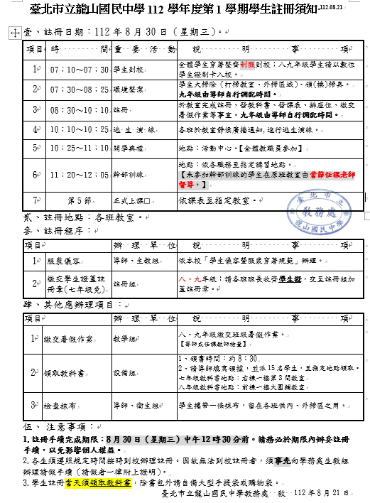 以下是臺北市立龍山國民中學112學年度第1學期學生註冊須知,請參考!